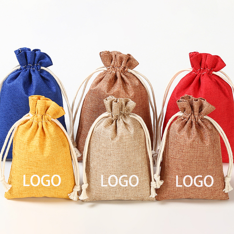 Custom Logo Size Trekkoord Jute Tassen Kleine Partij Gunst Jute Cadeau Tas Voor Kerst Bruiloft Snoep Hennep Verpakking Sieraden Zakje